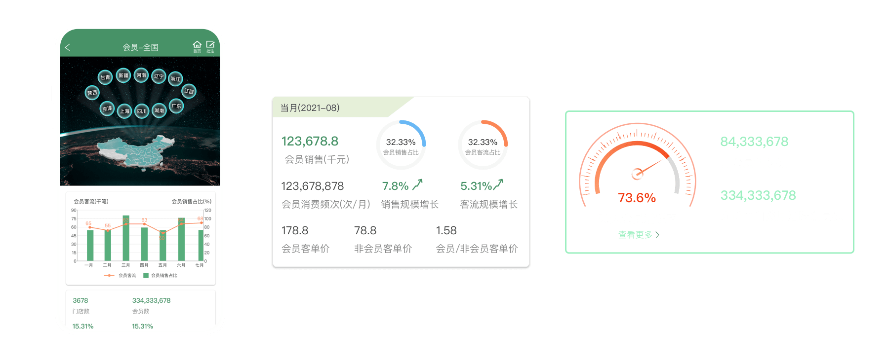会员数据直接与业务行为关联,展示会员数量、会员价值、提供更精准服务三大维度对会员的分析结果。发现规律、可视化展现,